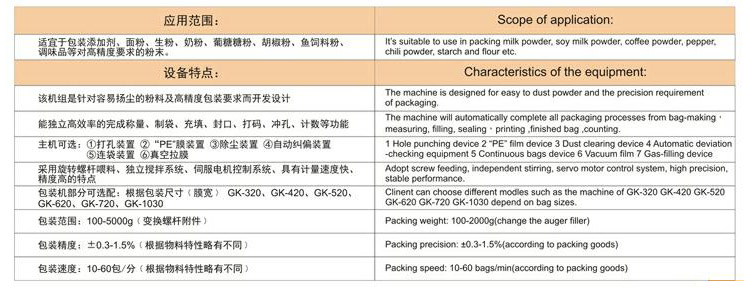 自動完成制袋,計量,下料,封合,分切,計數(shù)等功能,適用粉末物料的自動計量包裝機(jī)。